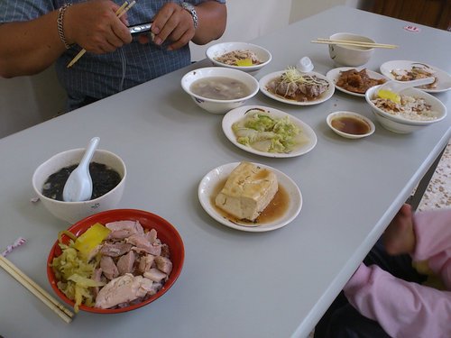 我們一人一碗雞肉飯,又點了很多小菜:旗魚、白菜、排骨肉、骨仔肉~
